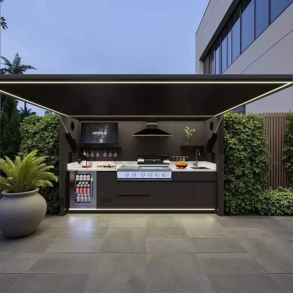 Create the ultimate outdoor cooking space with this premium outdoor kitchen set designed for functionality and modern style. Featuring modular cabinets and a grill island, this setup allows you to customize your layout to suit your backyard or garden space. Built with durable aluminum casing, it offers excellent resistance to rust, weather, and long-term outdoor use. The integrated LED lighting adds a sleek and contemporary touch while improving visibility during evening cooking. Designed for convenience, the cabinets provide ample storage for kitchen tools, utensils, and accessories. The grill island serves as a central cooking station, making it ideal for entertaining guests and preparing meals outdoors. Its modern design enhances patios, gardens, and backyard spaces with a clean and sophisticated look. Easy to maintain, the materials are built to withstand outdoor conditions while remaining simple to clean. The modular structure allows flexibility for expansion or rearrangement based on your needs. Perfect for hosting gatherings, barbecues, or family dinners, it transforms your outdoor area into a fully functional kitchen. The sturdy construction ensures stability and long-lasting performance. Whether you’re a casual cook or a grill enthusiast, this setup elevates your outdoor cooking experience. Combine style, durability, and practicality with this all-in-one solution. Upgrade your backyard with a versatile and elegant outdoor kitchen system.